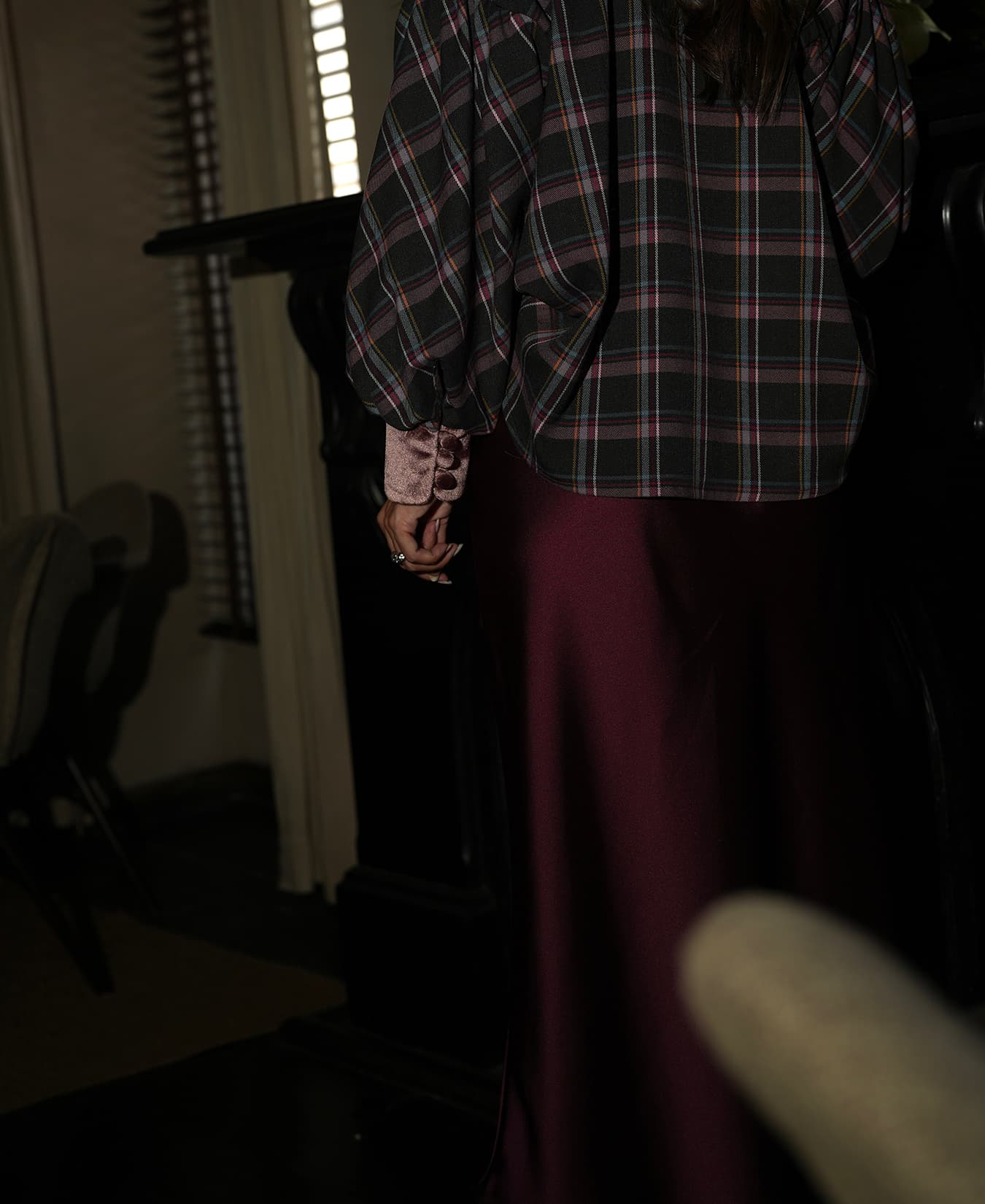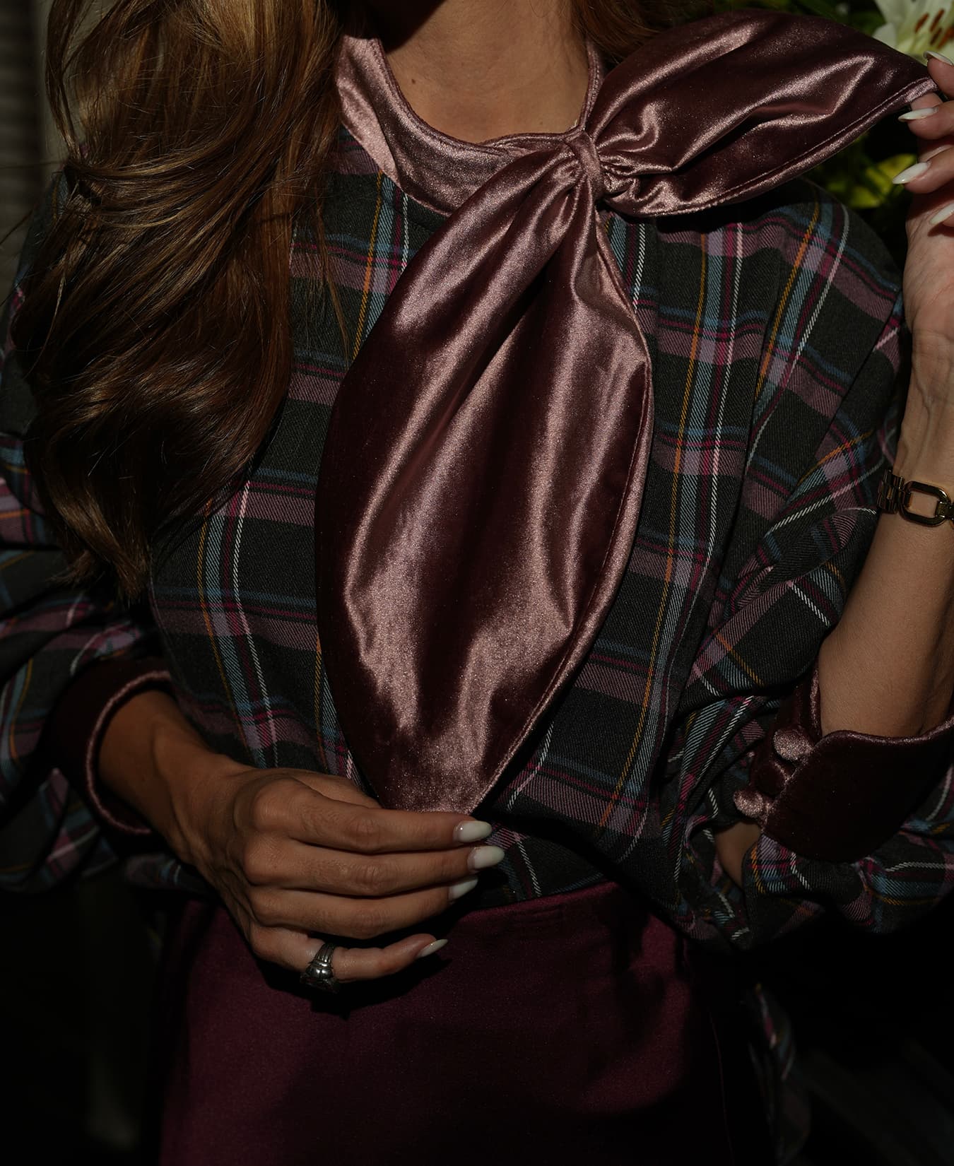 A peça secreta deste Natal: blusa tartan com gola e punhos em veludo rosa velho. Feminina, sofisticada e perfeita para ocasiões especiais.